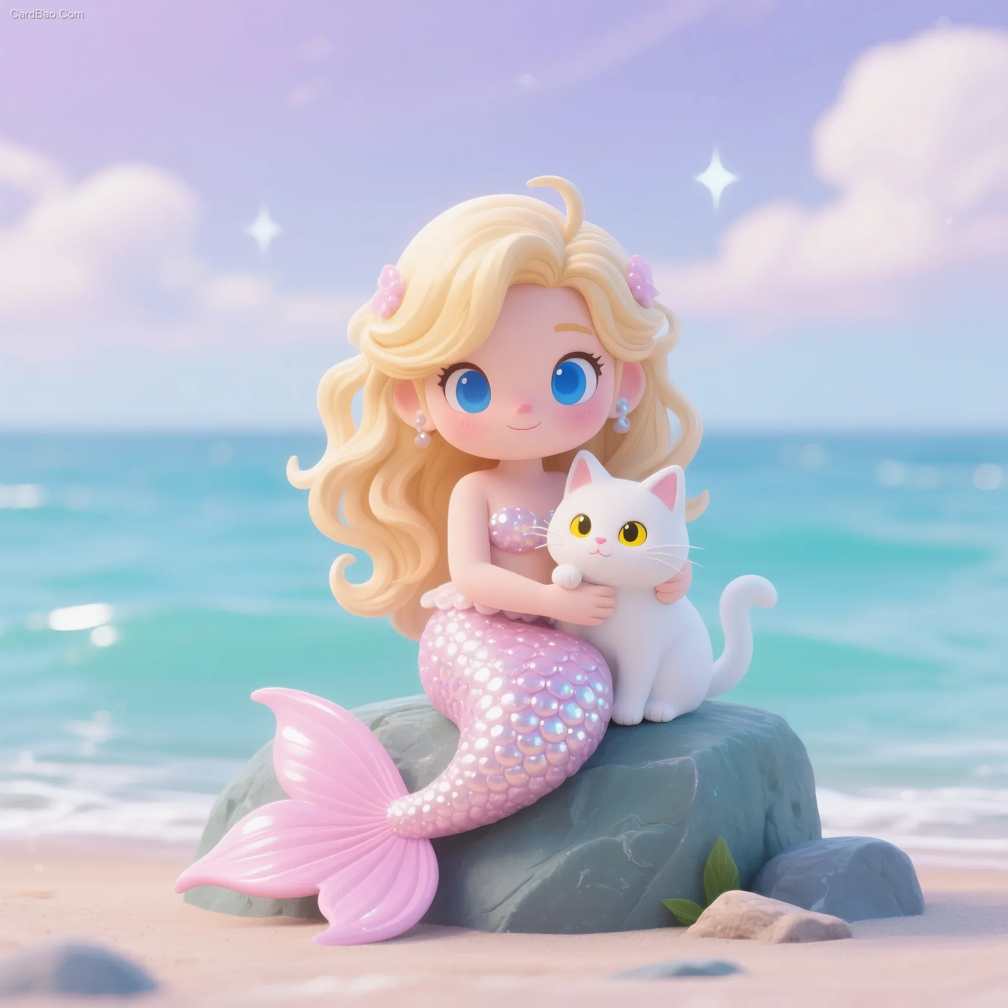 Chibi cartoon style, 3D modeling, miniature landscape: In the center of the frame is a mermaid with flowing long golden curly hair, blue eyes, and a fair-skinned upper body. Her lower body is a pink fish tail shimmering with a pearlescent luster, as she sits on blue-gray rocks by the sea. The mermaid holds a white-furred cat in her arms, which has bright yellow eyes. The background features a soft ocean and sky, with the sea water in a clear turquoise hue, and faint clouds and starlight in the distance. The overall style is fresh and soft, with smooth and natural lines, filled with a fairy-tale-like dreaminess and warmth, resembling a beautiful underwater fairy tale scene, with soft pink, light blue, and lavender as the main color palette.