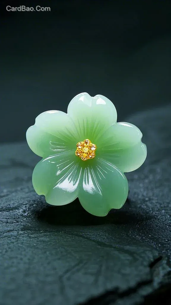 背景颜色高级单一,一个浅绿色表面抛光的玉石,刻成一朵梅花,梅花的花芯是黄色的小钻石,高级,超逼真,艺术感,3D,立体,唯美