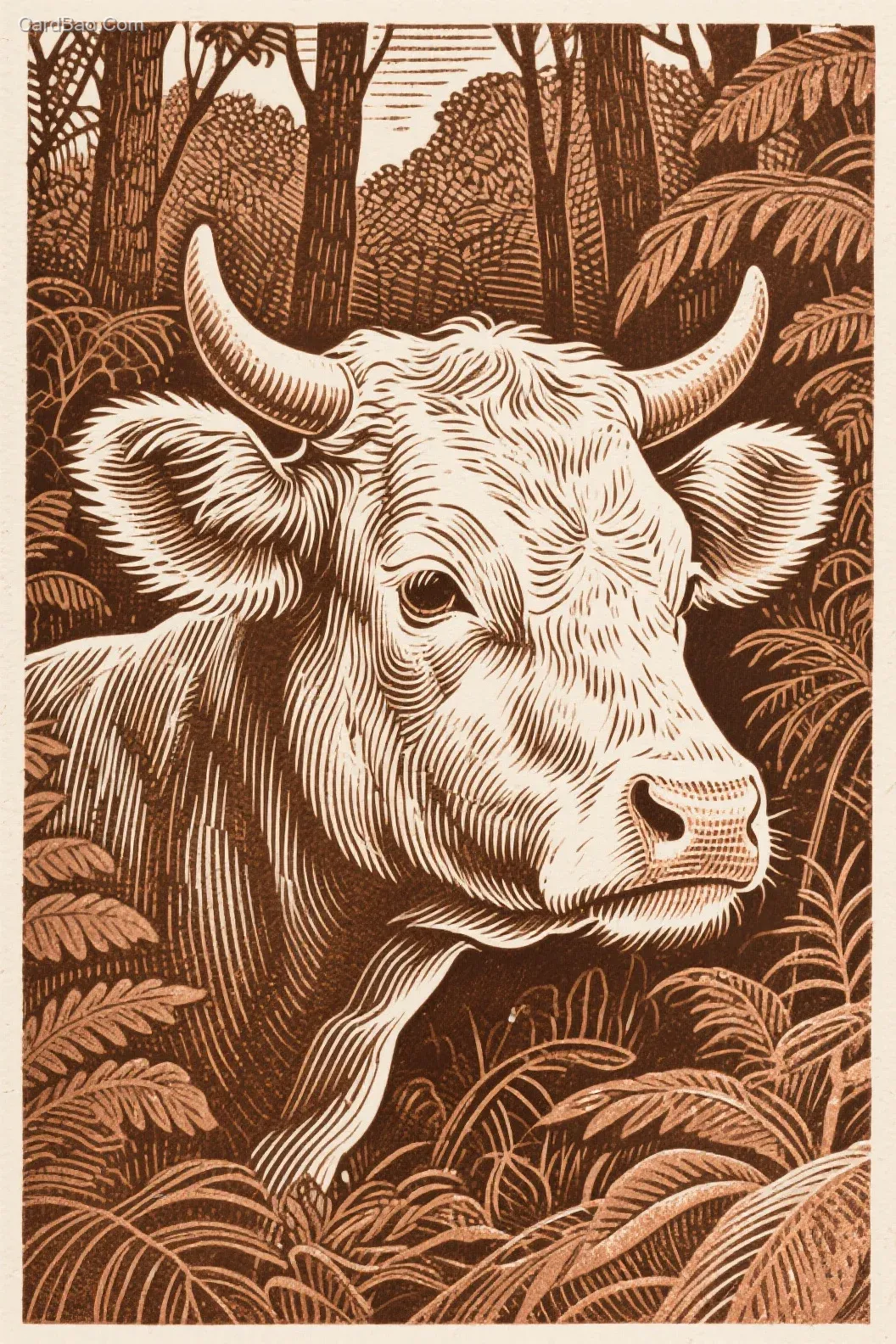 丛林包围的小牛头像凹版印刷线稿,0.8mm粗线勾勒外轮廓,0.2mm细线刻画表面皮肤,保留铜版雕刻痕迹,棕色,丛林背景