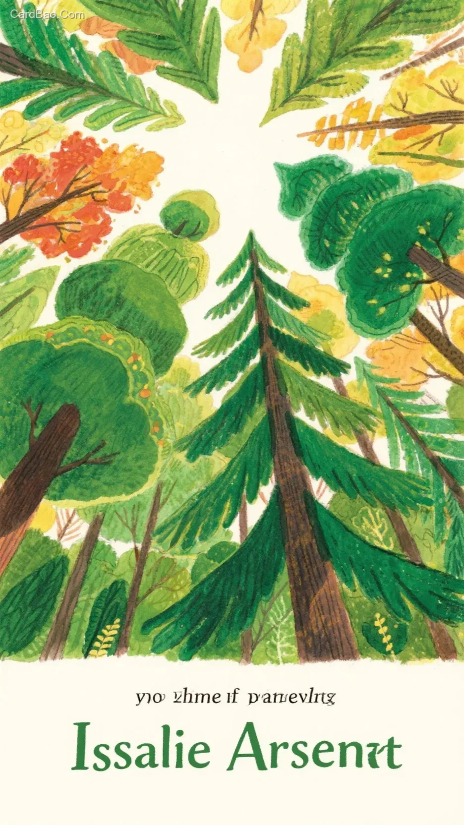 :Isabelle Arsenault 风格的儿童图画书插图,秋天,仰望天空,郁郁葱葱的森林,生机勃勃,绿意盎然,水彩风插画,大师级构图,高清图