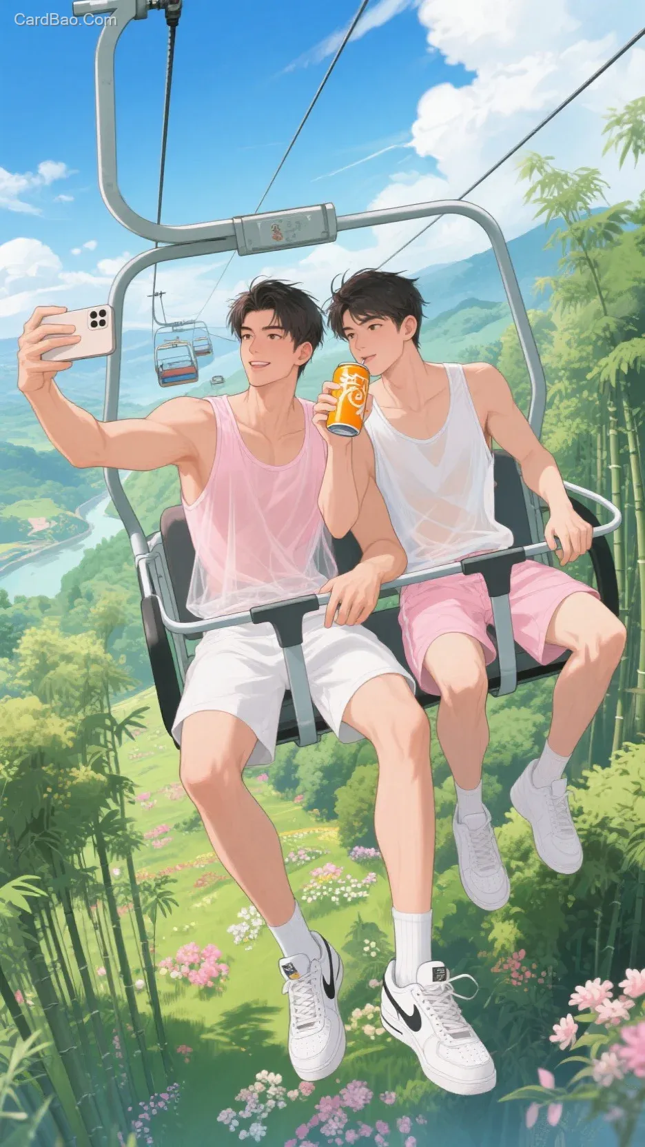 两个帅哥正在乘坐上山的缆车,25岁,身高190cm大长腿,身穿浅粉薄纱背心,白色短裤,空军一号板鞋,拿着手机自拍,另一人穿白色薄纱背心,浅粉色短裤,正在喝罐装橙汁,背景是俯视角度绿树花海,竹林婆娑。蓝天白云,青山绿水,国风动漫,港漫风格,CG,厚涂