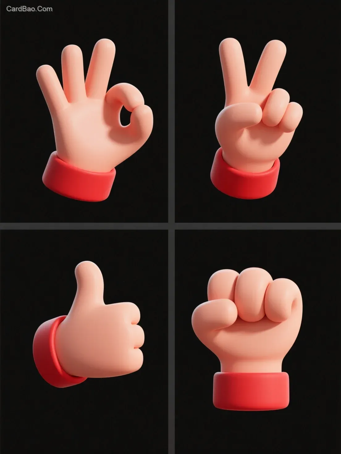 帮我生成一张图片:一套4个图标,4宫格。前视图,一只手,五根手指。红色袖子,柔和的阴影,光影,Q版,正面,红袖,C4D渲染,黑色背景。第一格是OK手势。第二格是比耶手势。第三格是点赞手势。第四格是握拳手势。比例 3:4。