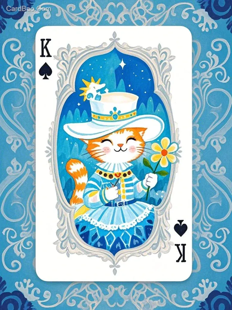 Picture book illustration, hand-drawn illustration, cute and healing, children's picture book painting style, crayon painting style, a Queen (Q) playing card, with the king figure on it being the image of a cat king.