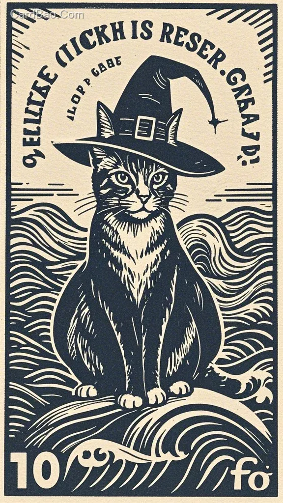 Bookplate, cat, magician, Nordic, ocean waves, Pop Art style, woodcut