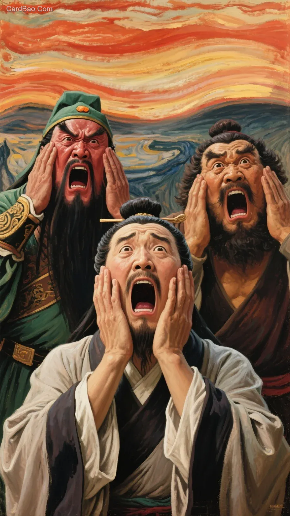 刘备,关云长,张飞,模仿名画《呐喊》,双手捂面,表情惊恐,自然融合,油画
