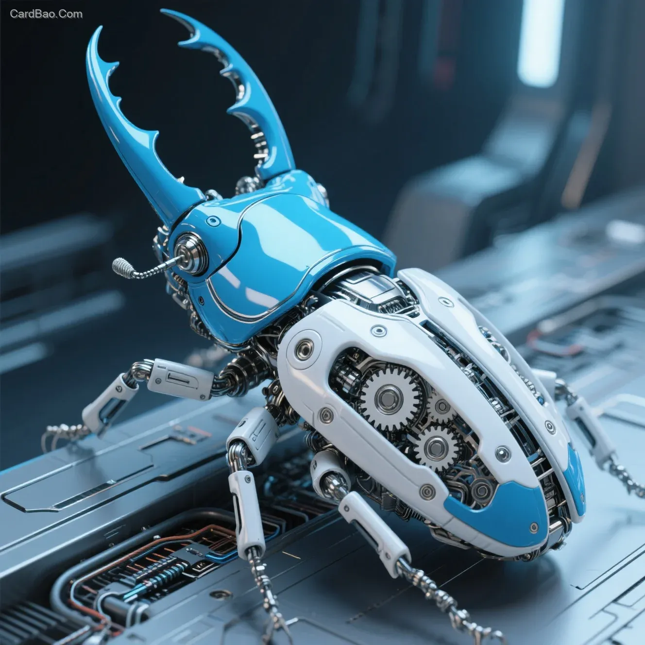 制作一只机械结构的独角仙,外壳有着强烈的金属质感。外壳的颜色由醒目的亮蓝色与白色形成鲜明对比,两种色彩相互交织,带来极具冲击力的视觉效果。在外壳的各处缝隙之间,隐约可见内部复杂且精密的机械结构,齿轮、连杆、线路等部件清晰可辨,闪烁着冰冷的金属光泽,仿佛在无声地诉说着其蕴含的强大能量与科技奥秘。