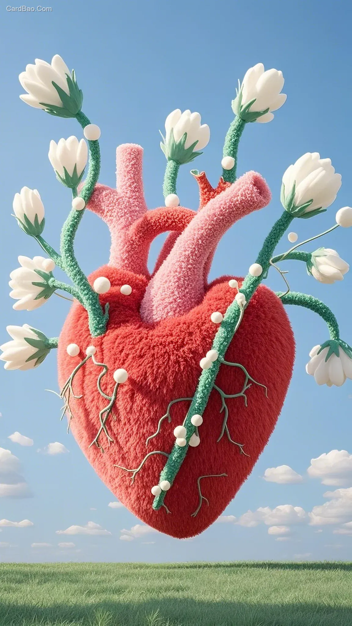 Magritte-style plush surreal scene: a giant red heart crafted from plush, with white and green floral branches twining around it, covering the heart like blood vessels, and a smooth plush surface. The blue sky and white clouds are made of plush material; this peculiar combination creates a surreal atmosphere. Mysterious and thought-provoking, the softness of the plush adds a whimsical tactile quality to the scene.