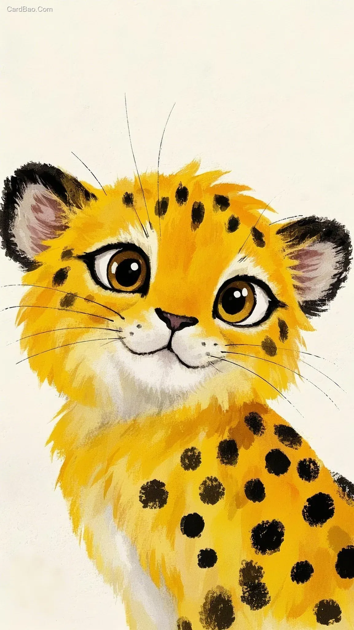 涂鸦画,涂鸦,插画,水彩插画,水彩肌理,治愈系,色彩弥散,水彩晕染,一只可爱金色小豹子在画面边缘探出头,灿烂纯真的笑容,大大的美丽的眼睛,极简,简约,纯色背景,大面积留白,
