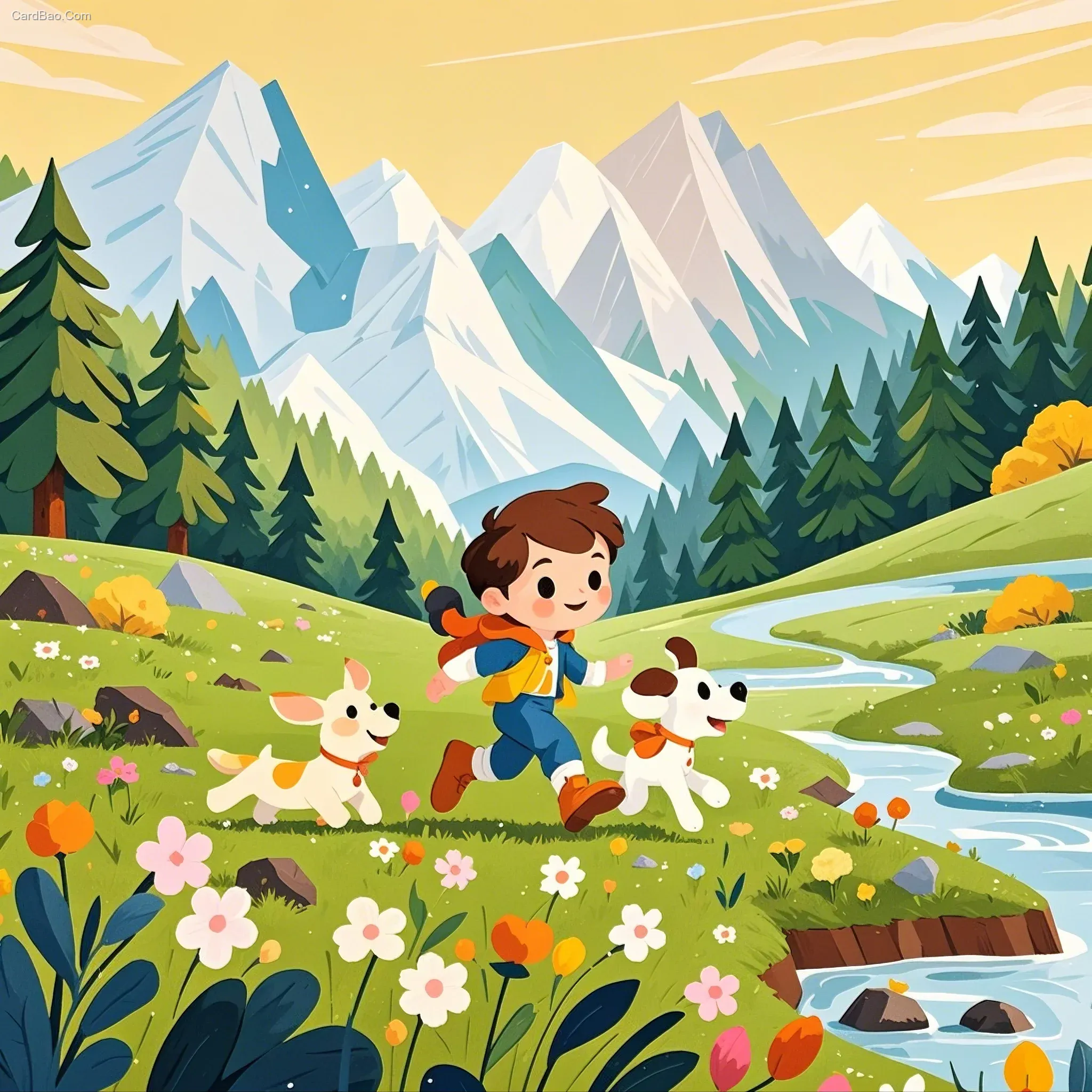 艺术的矢量插画,儿童绘本,可可爱爱,简洁的形状表达。挺拨的松树林,流淌的小溪,雪山,一个可爱的孩子和一只狗在草地上,后现代主义,少量留白,露出画布纹理,法国动画大师,获奖作品。