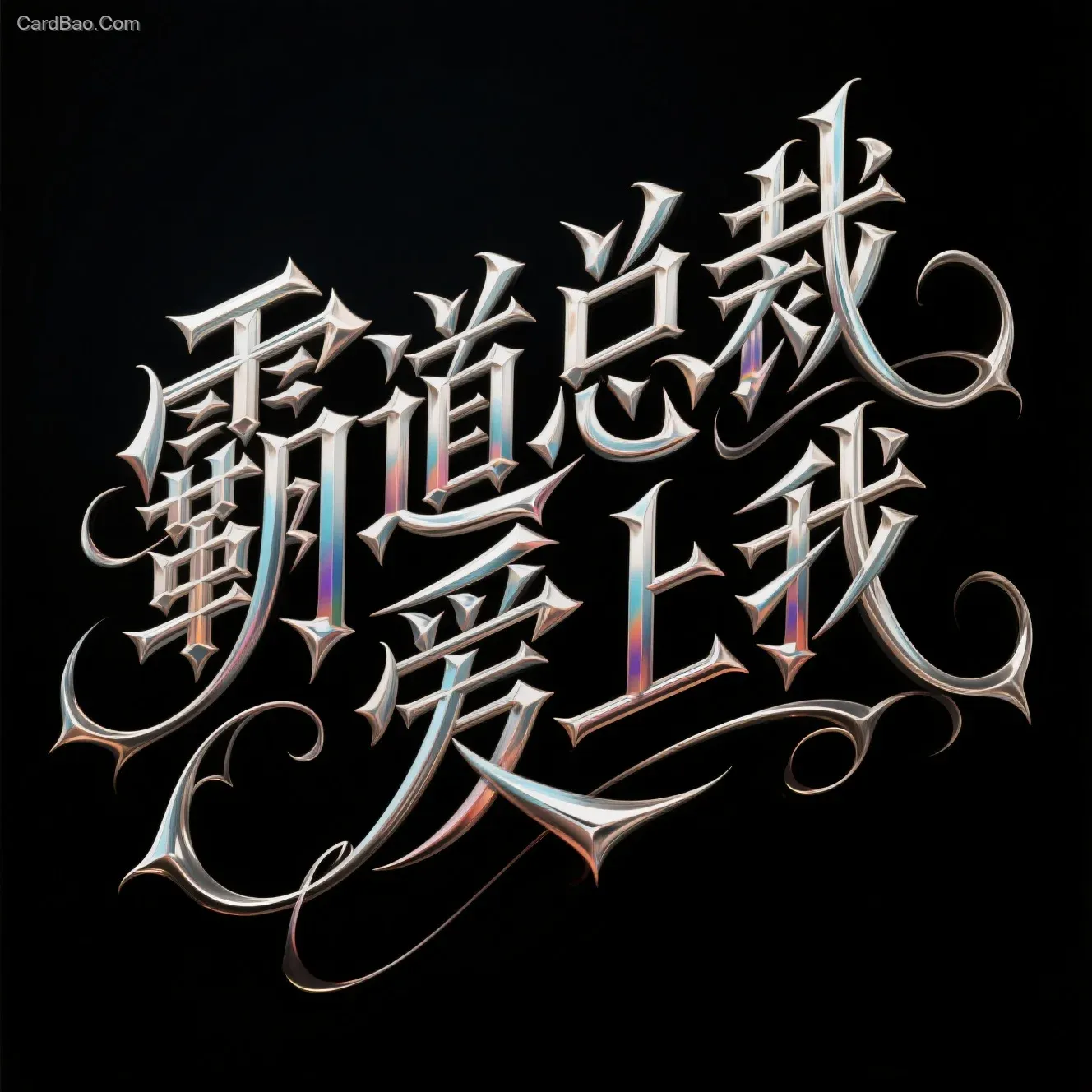 哥特式复古风格花体字'霸道总裁 爱上我',采用经典哥特体骨架整体向右倾斜,笔画变形穿插有流畅连笔效果,尖锐起笔收笔且粗细对比强烈,部分笔画镂空或扭曲变形,字体为酸性渐变金属的哥特式楔形立体风,有金属质感或复古印刷效果,纯黑色底,适用于音乐演出等艺术主题设计,类型艺术字体设计,特写,戏剧性氛围,哥特式复古风格