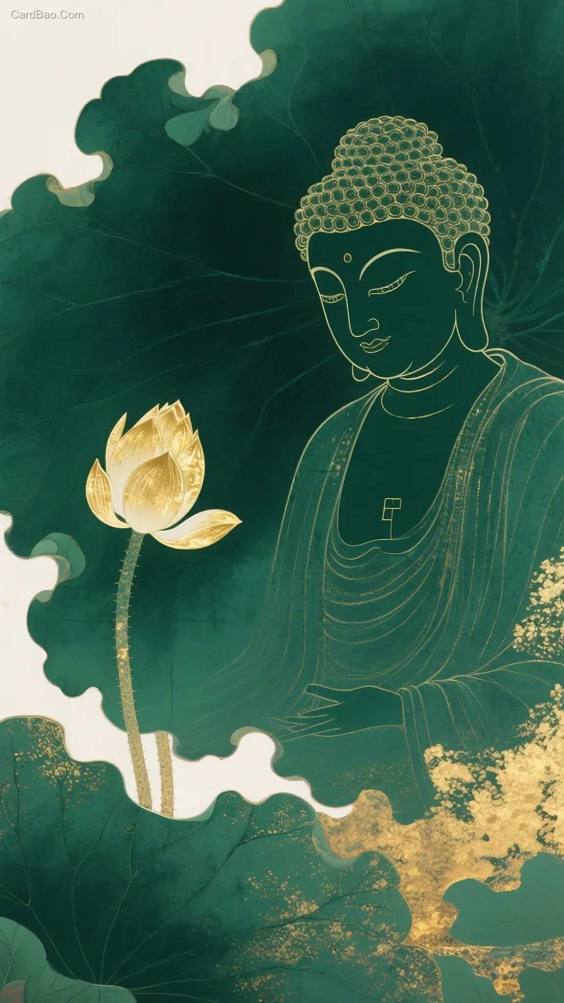 深绿色岩彩绘画佛祖,深绿色岩彩荷塘背景,金色荷花,含苞待放,干净透明。平面风格,肌理感,工笔,暗角,微光,留白,磨砂,禅意,国风,鲜活,典雅