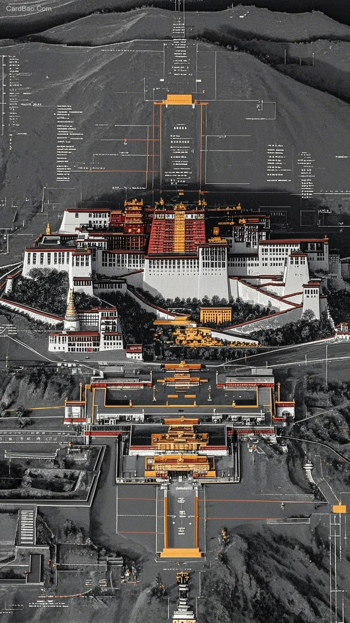 Design line drawing, distant view of the Potala Palace, design diagram. Dark-colored matte granular background, fine line drawing, black and white outline, with red and gold accents, annotate components and technical parameters. DSLR camera photographic effect. Macro lens. Technical blueprint style. Using Kodak T-Max 100 film.