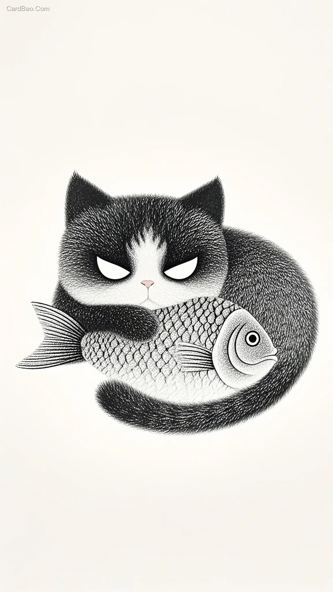 线描,面部大特写,可爱卡通猫抱着鱼睡觉,萌哒哒的表情包,毛发纤维,详细的线条,详细的动物插图,黑白交错的毛皮,新笔触,极简主义风格,白色背景