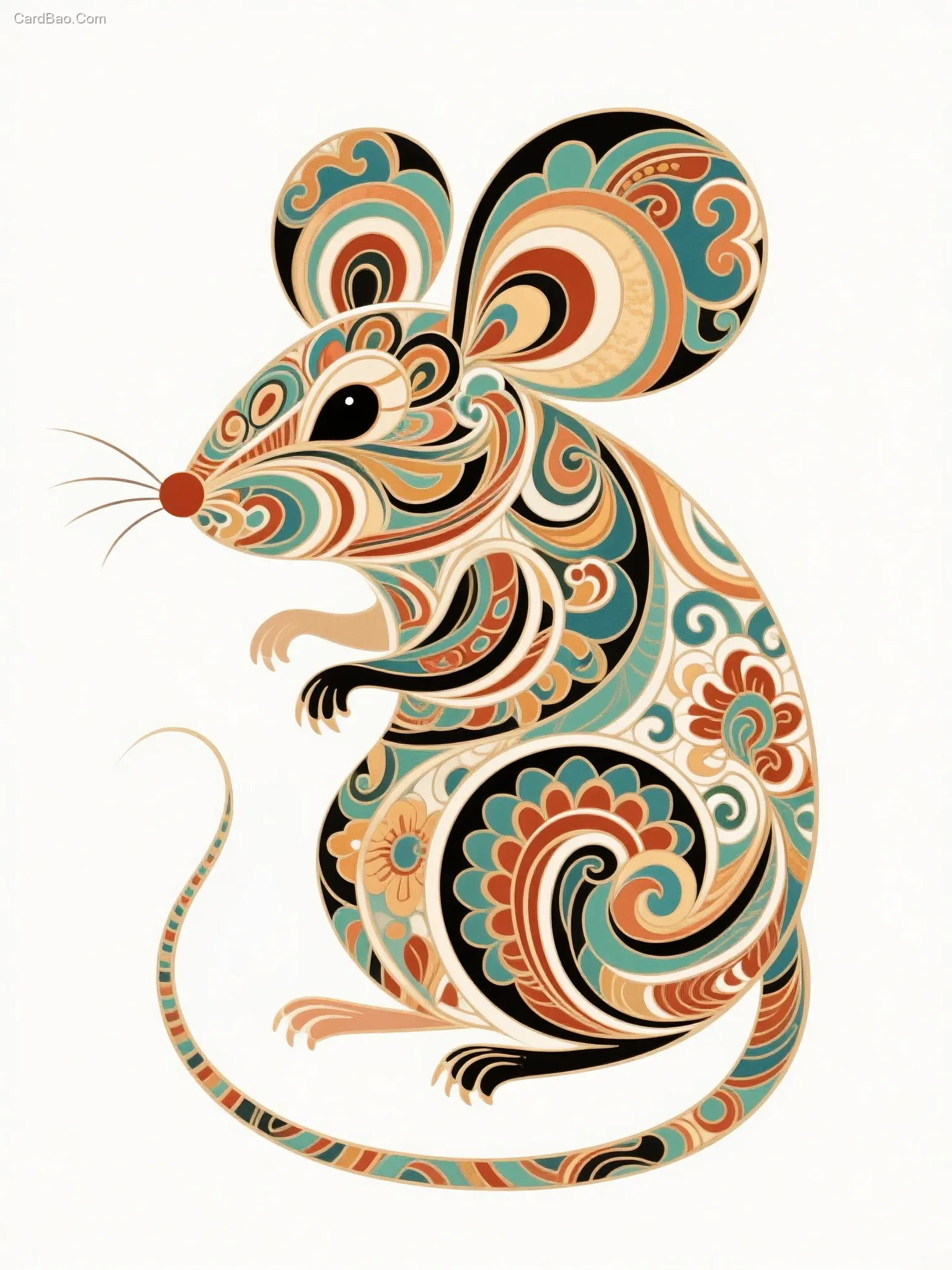 生肖鼠,抽象画风,花纹线条组合而成的老鼠,层次分明,中国传统纹饰,敦煌纹,色彩斑斓美轮美奂,线条柔美灵动,传统美学,立体感,白色背景,高清渲染。