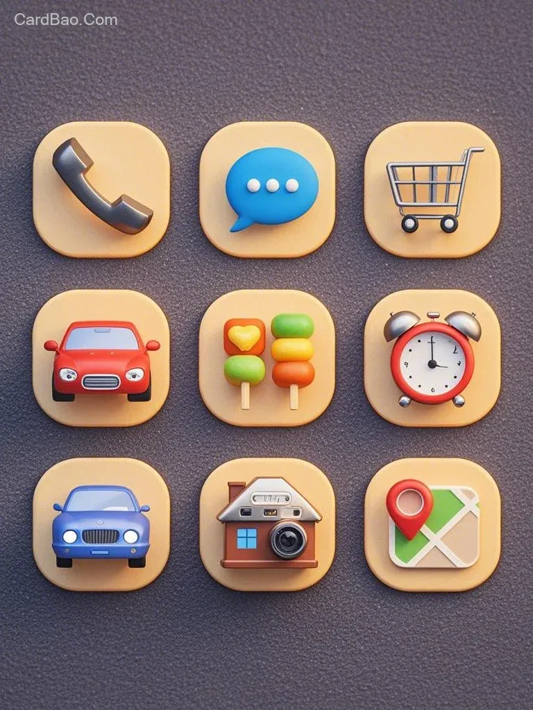 icon图标设计,图标顺序依次是:电话,聊天,购物车,关东煮,小汽车,小房子,相机,地图,闹钟,可爱卡通,3D,立体感,颜色统一
