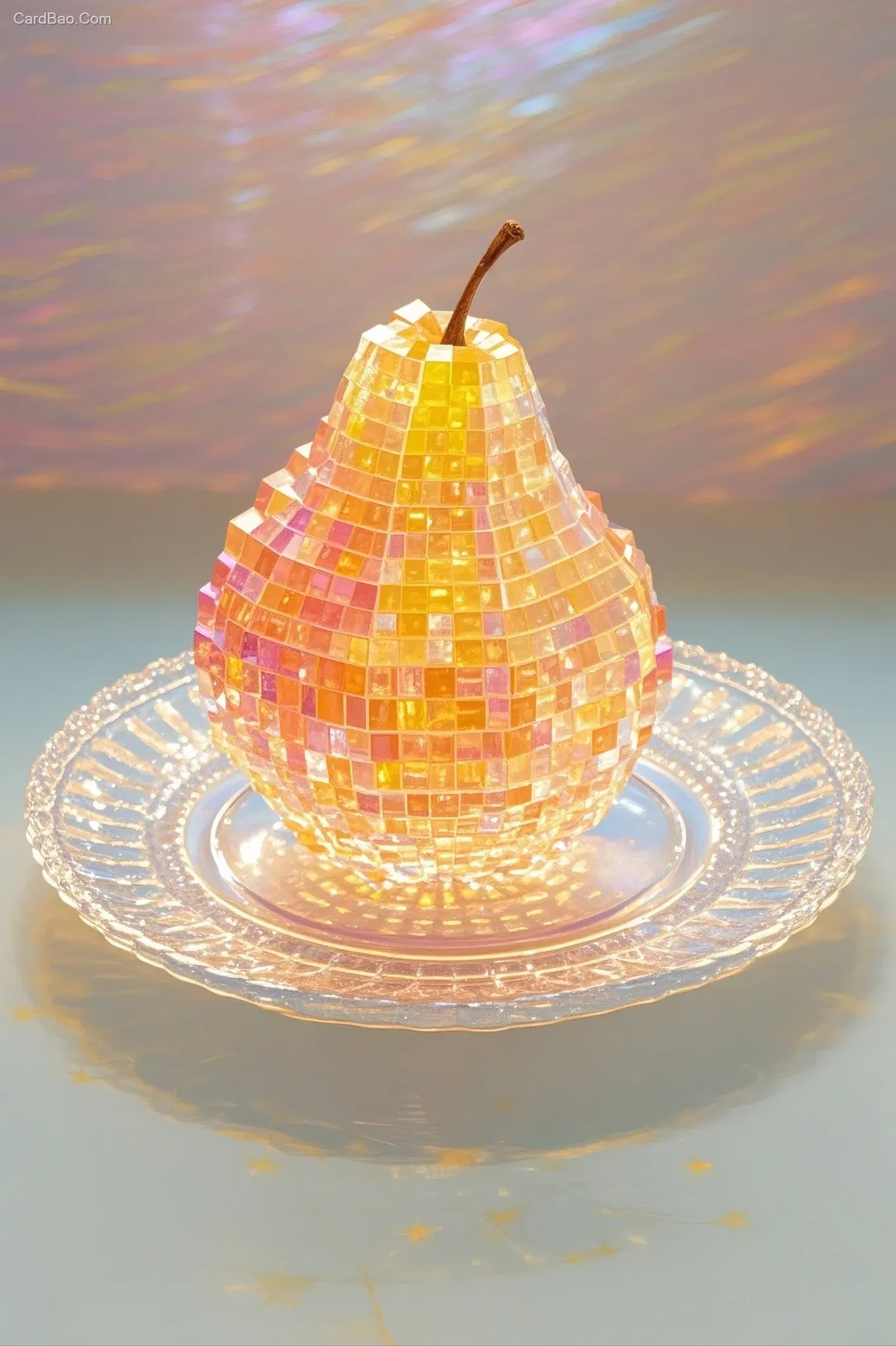 Overhead view: a blurred silhouette of a gradient pear composed of transparent square mosaic particles, placed on a glass plate; hazy, surreal artistic treatment, pixel art, particle diffusion, material collage, misty, Gaussian blur, glitch art, large area of negative space, blurred edges. Low saturation, light yellow, orange, and pink tones, warm colors, pure white fluffy ins-style edges, light oil painting background.