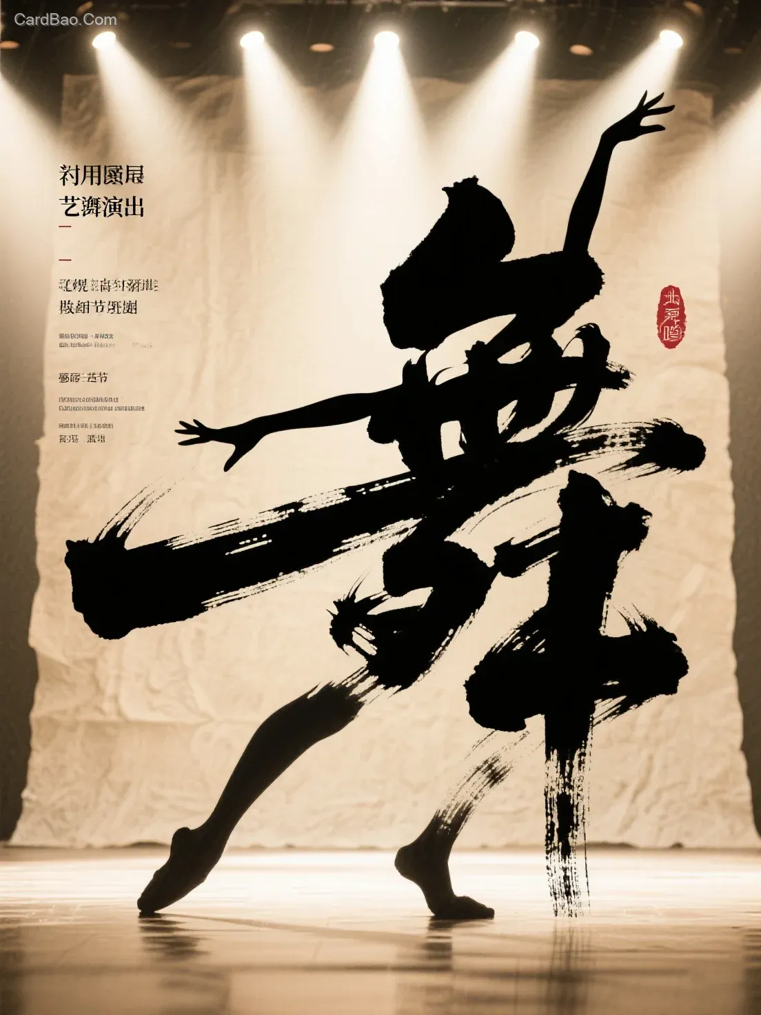 Performance Poster: The character "舞" (dance) stretches its limbs to form a dancer's silhouette, with ink wash brushstrokes combined with dynamic photography effects, and the background features stage lighting with a rice paper texture.