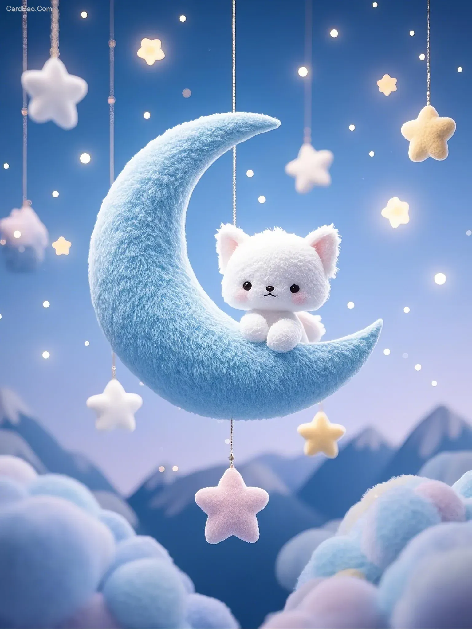 一只可爱的毛绒质感的月亮挂在天上,四周有许多可爱毛绒的小星星在闪硕。梦幻高清