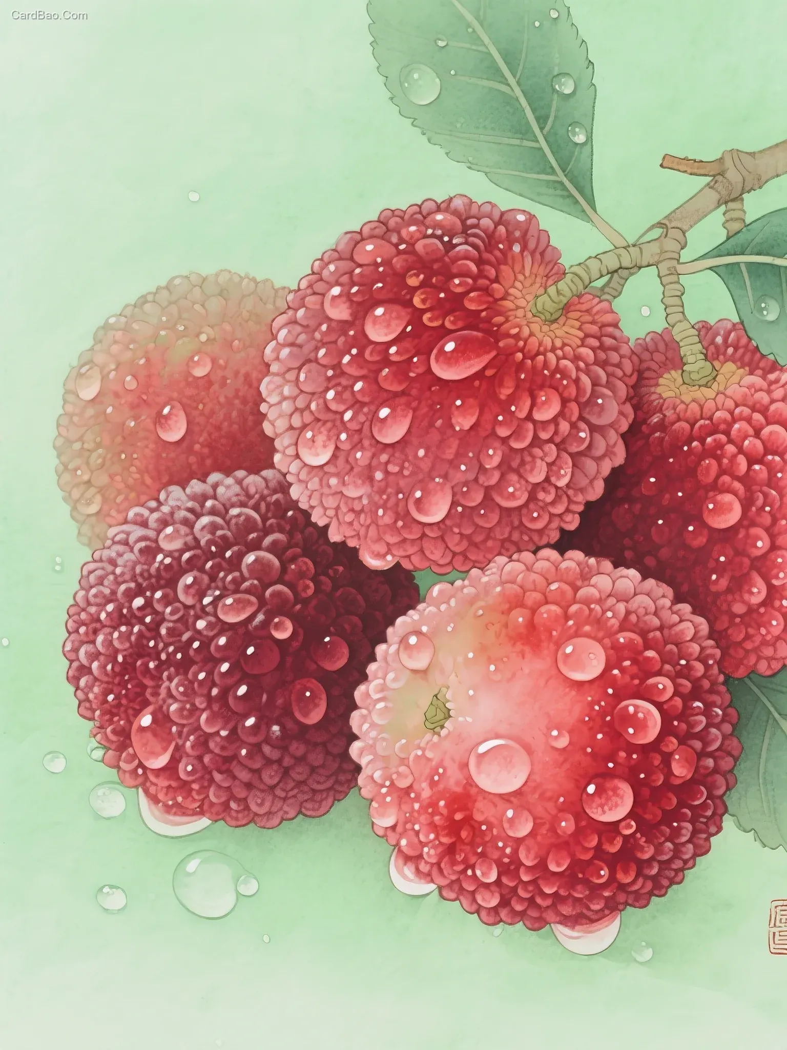 新中式工笔画风格,现代国画,几颗杨梅放在一起,上边有水珠,显示很新鲜的感觉,生动有趣,艺术构图,先锋艺术,极致的清晰度,简约。高级,杰作,饱和的颜色,明亮画面,明亮色调,绿色调画面。