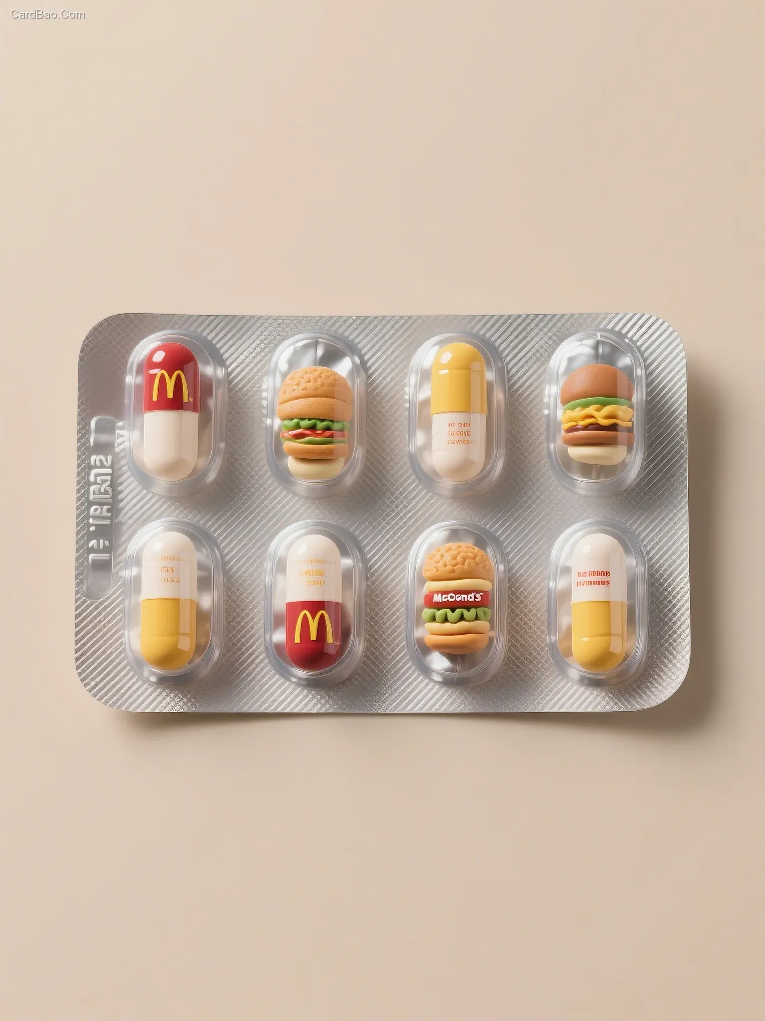 A highly realistic, highly detailed image of a tablet blister pack, with tablets arranged in a 2x5 layout (two columns, ten tablets total). Each tablet represents a different McDonald's food item. All tablets are encased in transparent blisters with a glossy finish, backed by silver aluminum foil featuring a fine diagonal texture. The overall visual style is minimalist commercial product photography, utilizing soft ambient lighting and set against a neutral beige background to highlight the tablets as the main subject.
