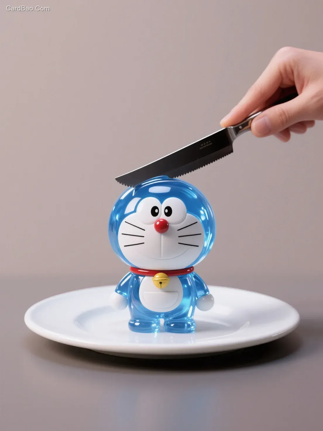 Super cute IP, Doraemon, placed on a white plate, handmade resin figurine, semi-transparent body, gelatinous material, jelly-like texture, fine glossy finish, solid color background, holding a western-style knife in one hand ready to cut from the top of its head, 3D rendering, Octane render, surrealism, realistic style, jelly texture, solid color background.