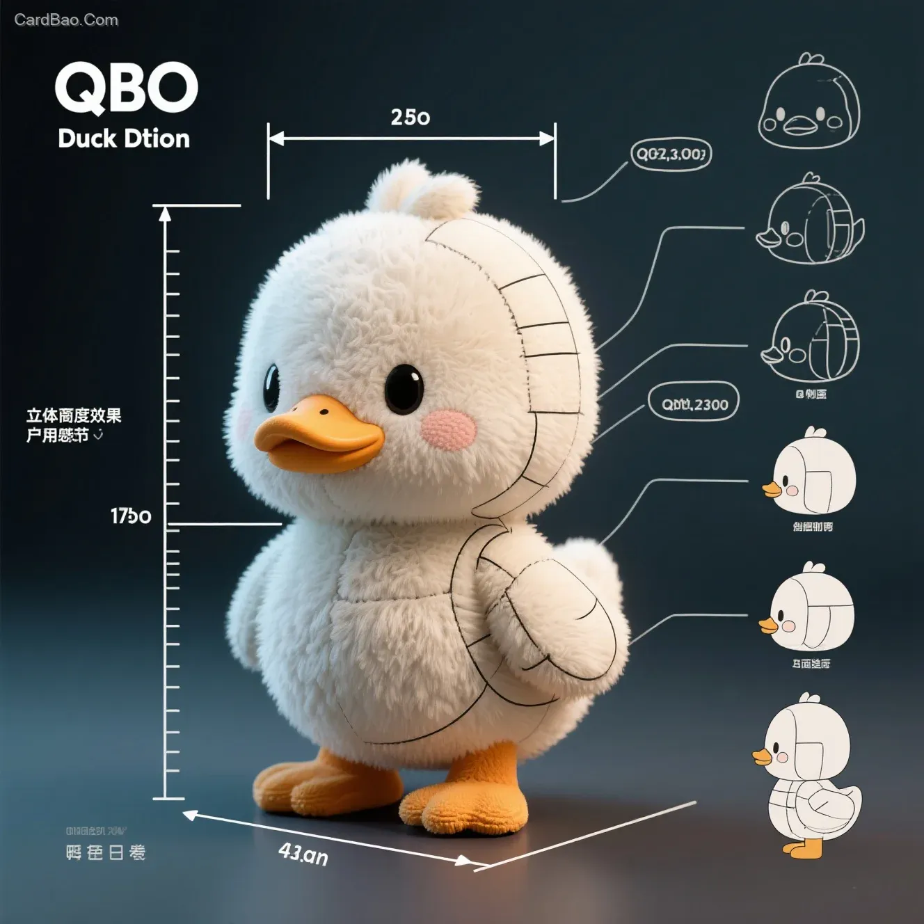 Chibi-style fluffy little duck plush toy design sketch, including dimensions and explanatory text annotations, with lines and measurements indicating the dimensions of each part; accompanied by scattered thumbnails showing different angles placed next to it, and featuring a stereoscopic depth effect. Purpose: reference image for plush toy design; type: design sketch; chibi style, close-up, tech-inspired atmosphere, precise and detailed.