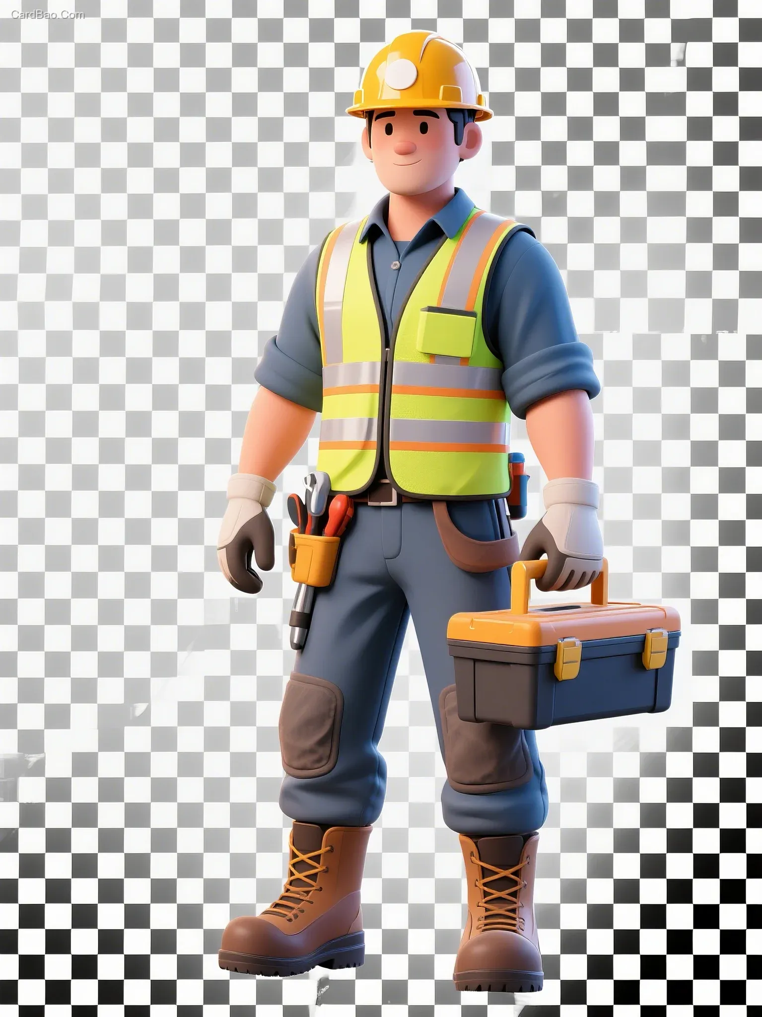 主体:建筑工人全身像,特征:安全帽/工具箱/反光背心,3D,透明背景,PNG格式,矢量风格