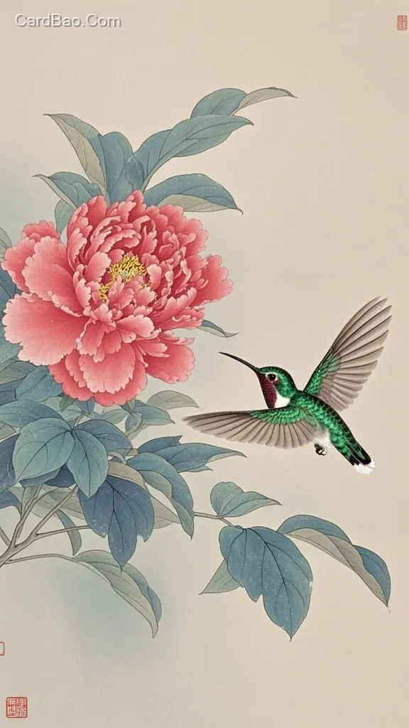 工笔重彩花鸟画,悬停在牡丹花前的蜂鸟,体态优雅翅膀完全舒展,田世光经典技法勾勒羽毛层次与花脉走向,矿物颜料渲染翠绿羽毛与朱红花冠,焦墨细笔勾出尾羽金属光泽,背景淡彩晕染营造朦胧古绢质感,超高清画质呈现鸟喙绒毛与花瓣露珠的微观细节