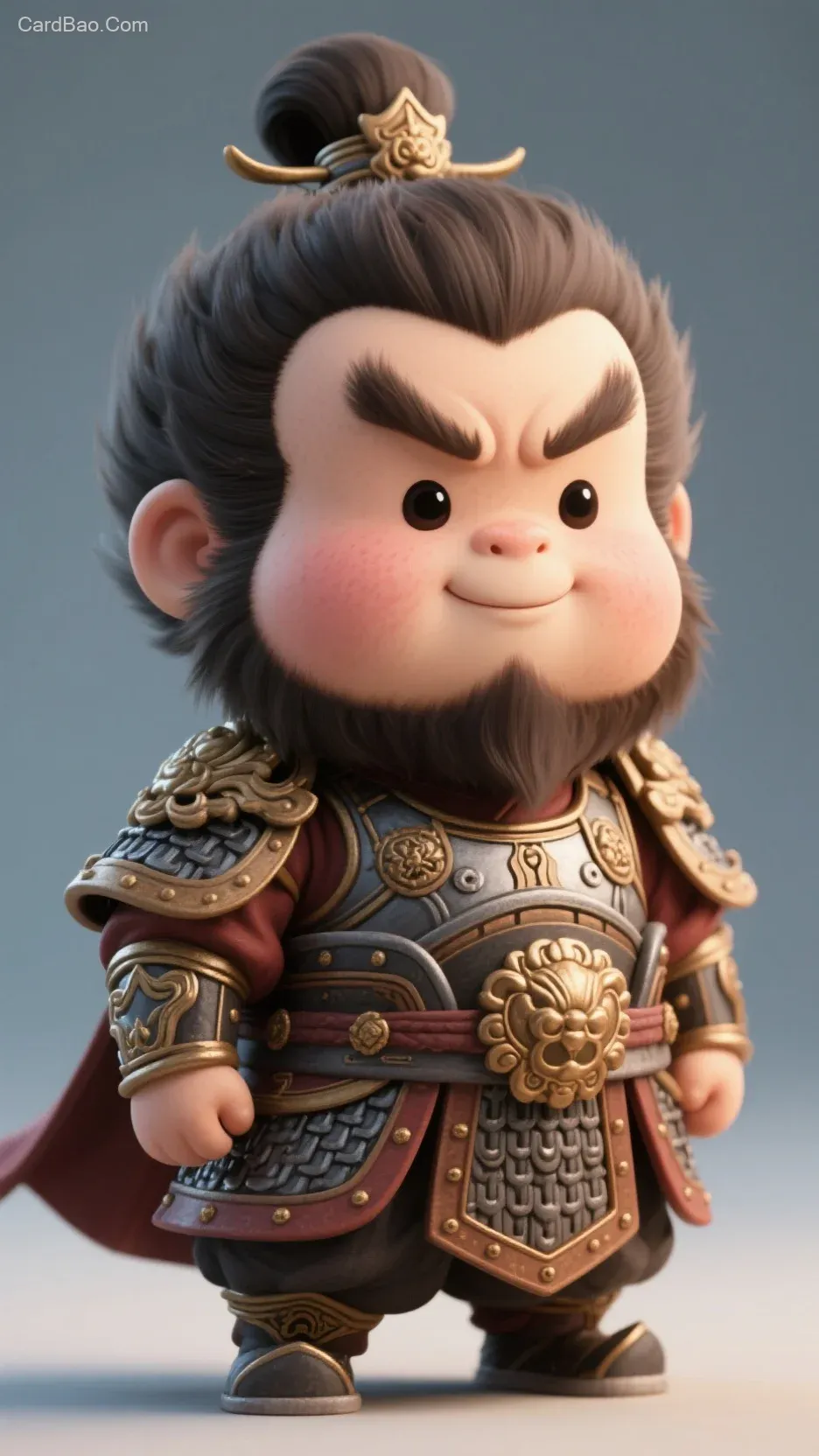 张飞,身穿战袍,萌版,逼真的皮肤质感,头大身小,全身胖乎乎,3D立体,细节细腻,32k分辨率