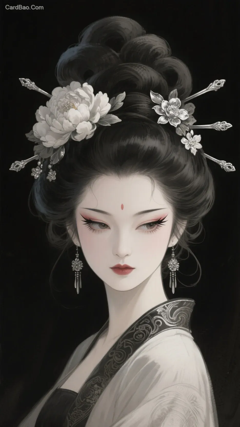 Illustration, light and shadow contrast, Eastern elements, ancient style, brushstrokes, sense of storytelling in the scene. The woman has an enchanting makeup with upturned eye makeup, eyelashes slanting upward at the outer corners, deep-set and three-dimensional facial features; full-body shot. The woman's hairstyle: a voluminous cloud-like high bun stacked layer upon layer, resembling a blooming flower, outlining the elegant contours of the hair strands. Exquisite silver ornaments with flowers interspersed, adorned with four wide silver hairpins, and delicate patterns faintly visible among the hair strands.