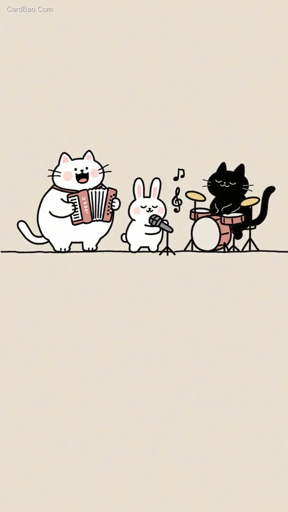 Hand-drawn, on a straight line: two cats—one is a fat and large white cat with an exaggerated expression, holding an accordion in its hand; the other is a small, elegant and slender black cat, one-tenth the size of the white cat, sitting on a drum set. In the middle, a chubby little rabbit, anthropomorphic, holding a microphone and singing with its eyes closed. Musical notes are nearby. Cartoon anthropomorphic style with line art. At the bottom of the image, there is a large area of blank space, against a beige background.