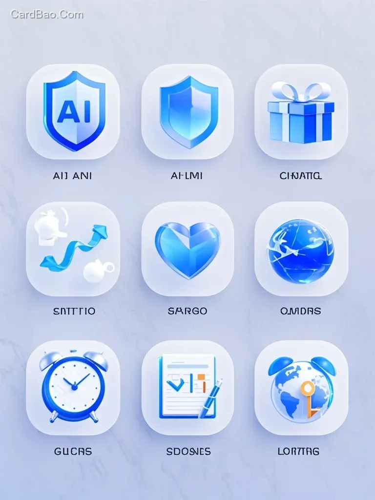 icon图标设计,图标顺序依次是:盾牌,曲线,爱心,礼物,AI,记事本,地球仪,地图,闹钟,立体科技感,水晶半透明,3D,立体感,颜色统一