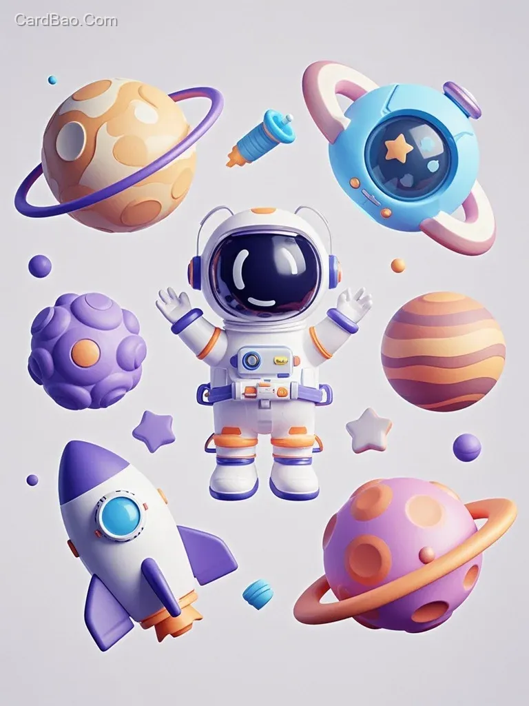 3D icons with a space theme, various designs, suitable for UI. Focus on cute astronauts, space shuttles, or celestial elements like planets. Use a soft macaron color palette and white background. Style reference: Dribbble. Highly detailed, high resolution.