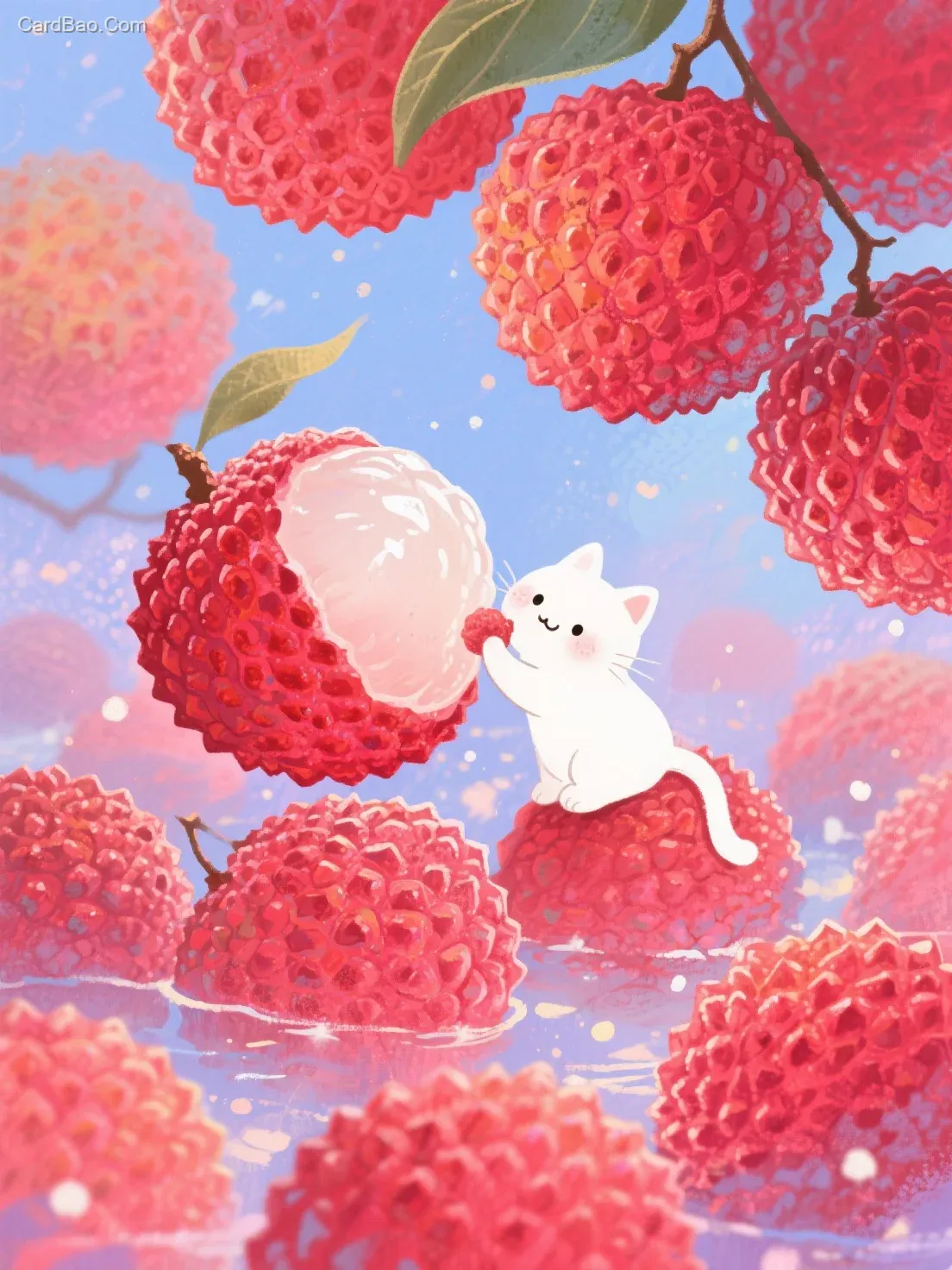 梦幻,治愈,宁静,梦境,颗粒感,萌,肌理感,水粉,手绘,又大又红的荔枝,荔枝饱满多汁,十分诱人,覆盖整个画面,有很小的小白猫吃荔枝,治愈