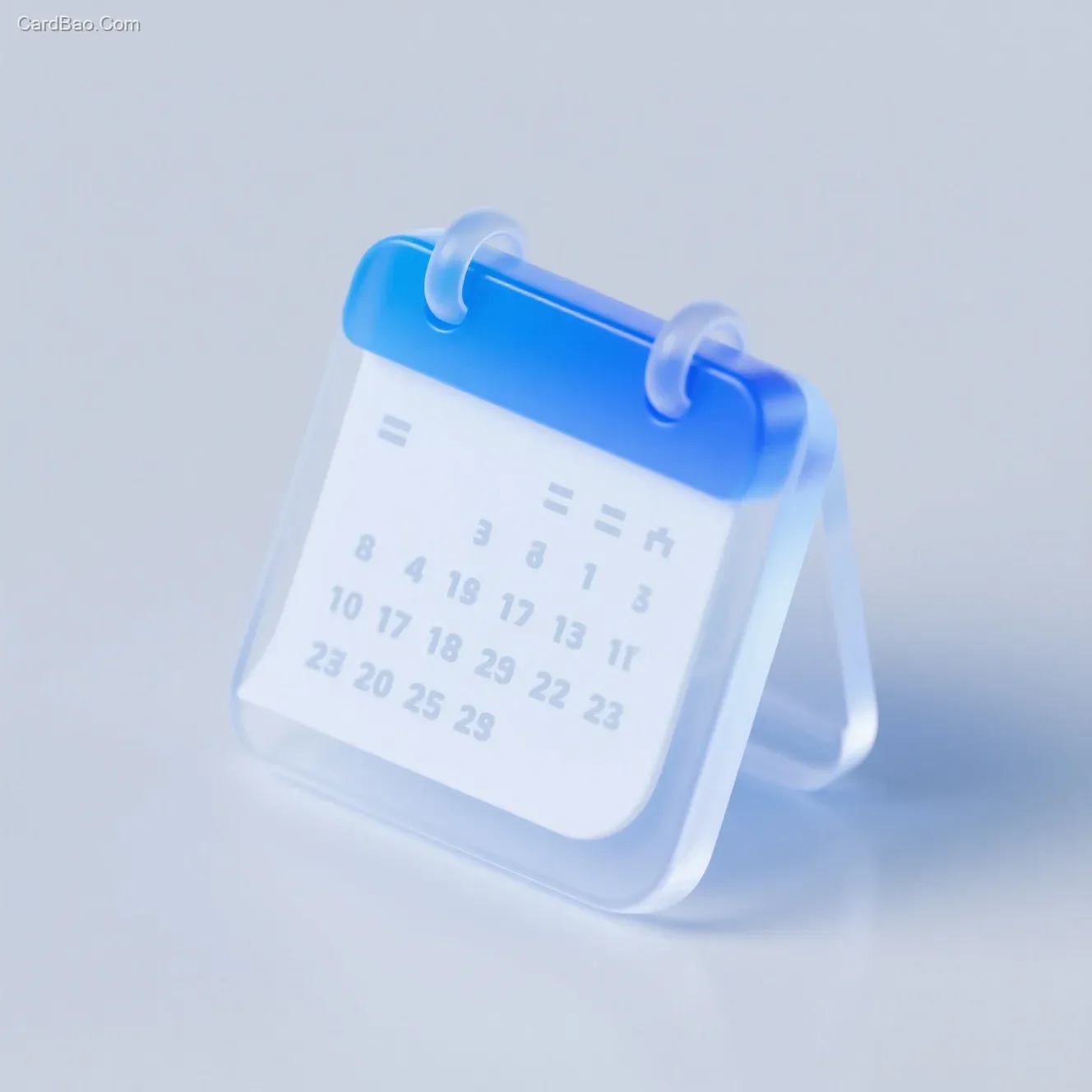 日历图标,单元素,主色调蓝白,透明科技感,未来感,光滑透明材质,柔和光影,磨砂玻璃质感,简洁布局,等距视图,Blender,C4D,细节丰富,干净的背景。