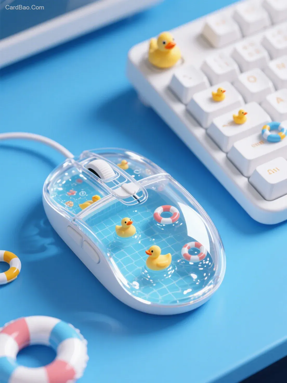 Surrealism, Industrial Design, Product Design, bird's-eye view, tilt-shift perspective, blue background; placed is a close-up of a fully transparent plastic mouse. Through its transparent cover, the interior is visible, filled with swimming pool water containing small ducks and swimming rings, boasting a highly glossy finish. A blue desktop sits below, with a white keyboard beside it; the keycaps on the keyboard also feature ducks and swimming rings. Instagram style.