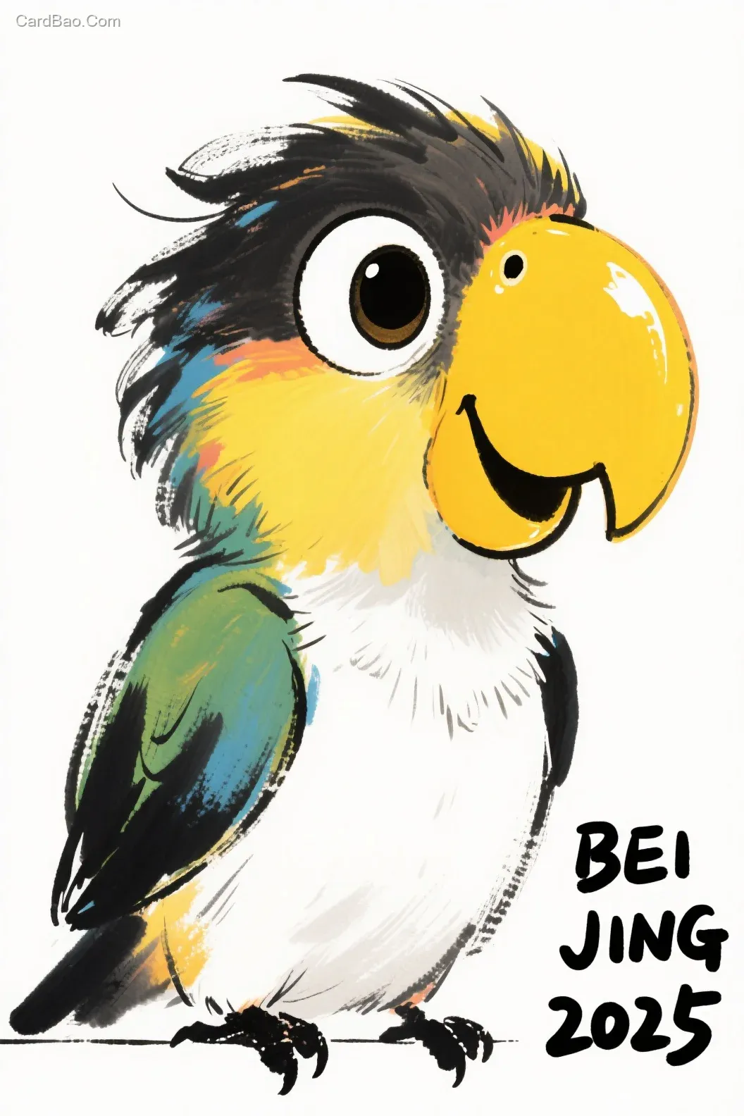 Healing Style Ink Wash Painting: A parrot in a sketchy brushwork style, with bright and vivid colors, plumage glowing with luster. It features a particularly prominent, shiny large yellow beak, exaggeratedly big, dewy and sparkling eyes, and puffed cheeks as if inflated. The parrot proudly displays a white chest, with a mischievous expression, and a messy, uneven, tousled and fluffy head. The head is rendered with extremely sketchy strokes to convey a sense of messy order—overall messy, sketchy, healing, and super cute.