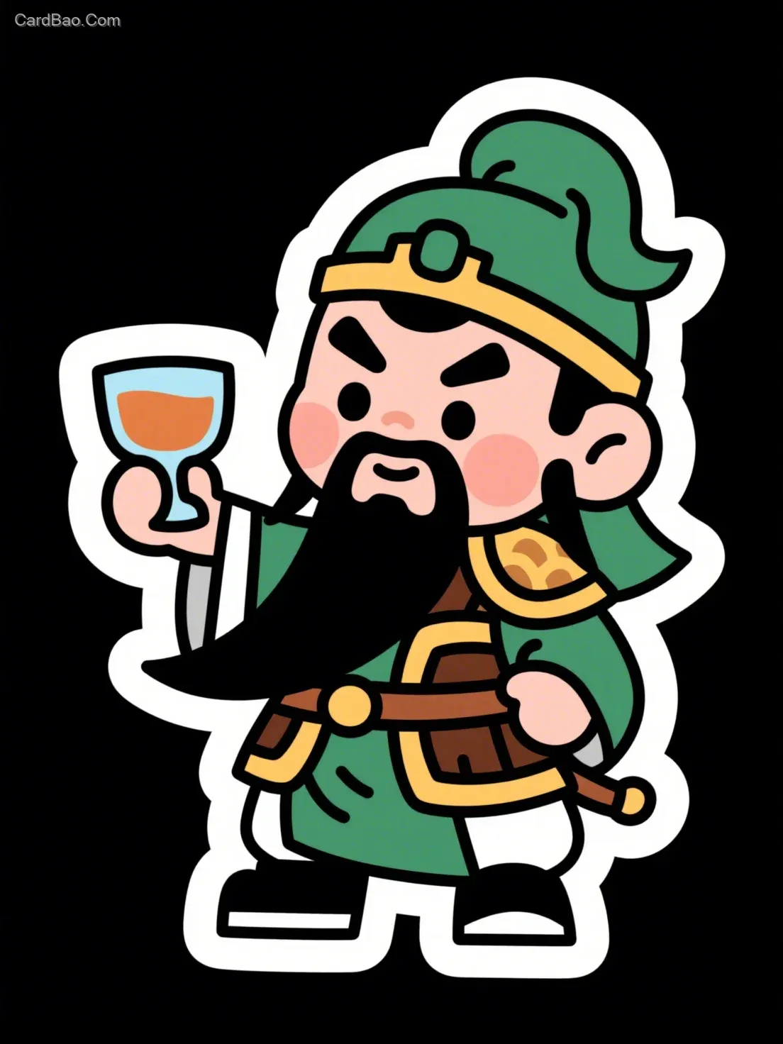 中国古风贴纸,q版卡通,一个古代关羽端着酒杯,卡通矢量风格插图,黑色背景