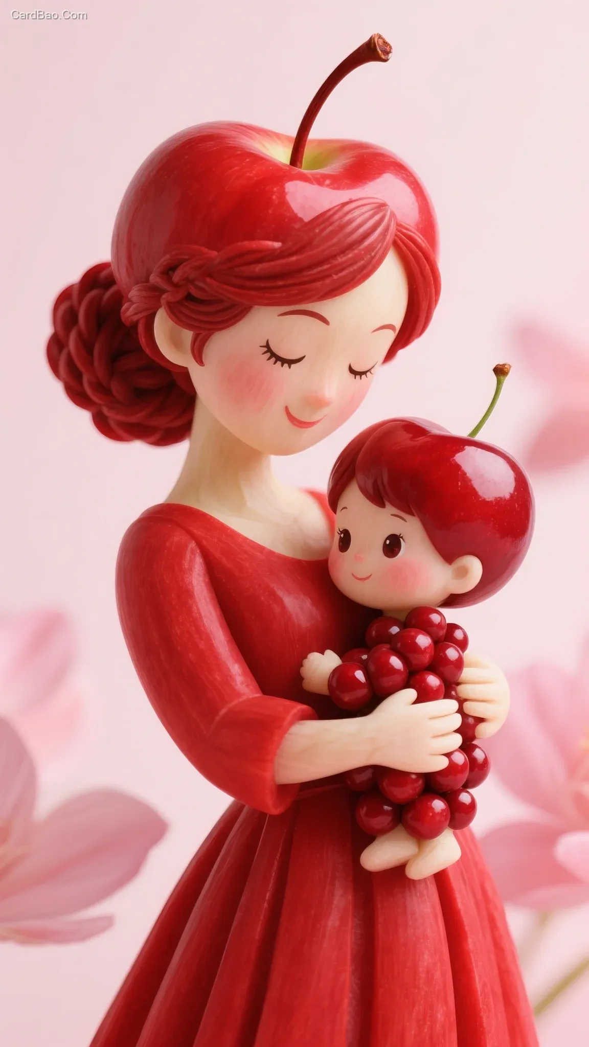 Using red apples and cherries as the main materials, create a mother-child image. The mother figure is carved from a red apple: its red skin is carefully polished to appear smooth and delicate, with a gentle and loving facial expression, curved eyebrows, and upturned mouth corners. Her hair is braided from cherry stems into an elegant bun, and she wears a red long dress. The child is carved from cherries: small cherries form the child’s body, with a larger cherry as the head, featuring rosy cheeks and sparkling eyes, held in the mother’s arms. The overall style is sweet and lovely with vibrant colors, set against a background of light pink petals.