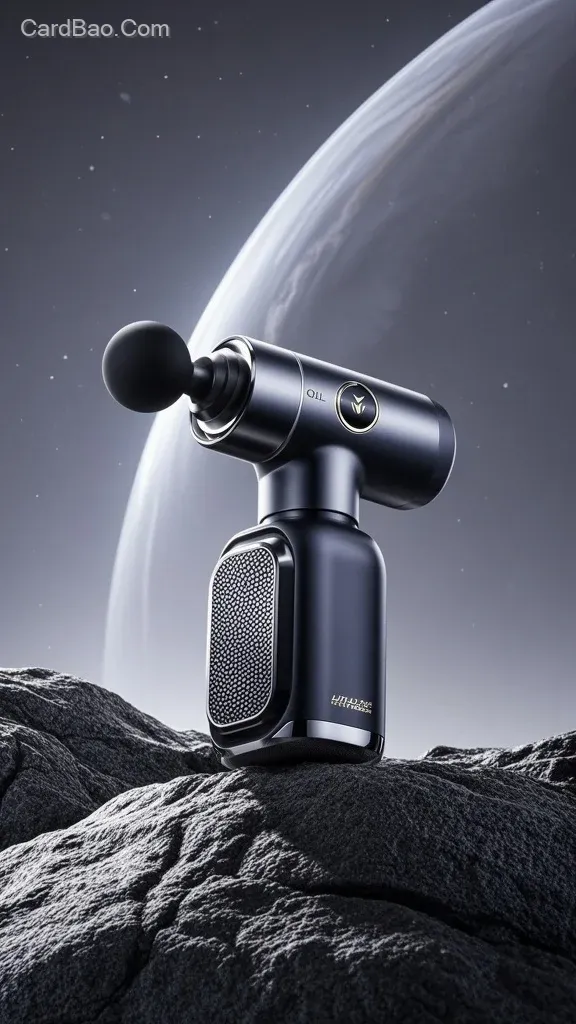 E-commerce marketing image with a fascia gun at the center, featuring texture, material quality, surreal, sci-fi, dreamcore, low-angle perspective, real photography, exquisite realistic texture, high-end, atmosphere, strong light-shadow contrast, strong perspective, and tension.