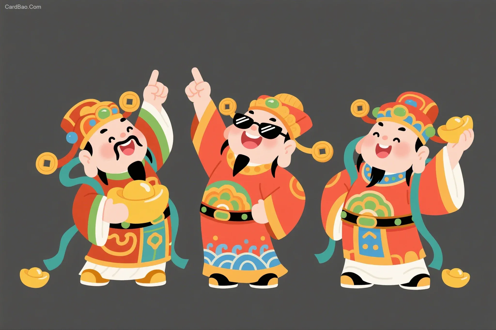 Three Gods of Wealth, different poses—for example: one hand pointing to the sky, hands raised above the head in a supporting pose, and hands on hips. One of them is wearing sunglasses, standing, facing the camera, smiling happily, with blank space on one side of the image. Chinese style, Q-version, illustration effect.
