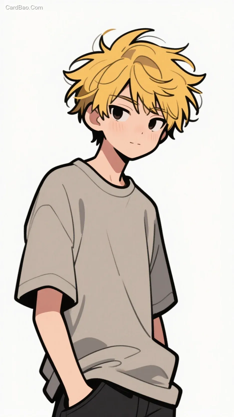 "Thick line style, Japanese cartoon illustration, a teenage boy with messy blonde hair, stylish and cool, clean and simple background"