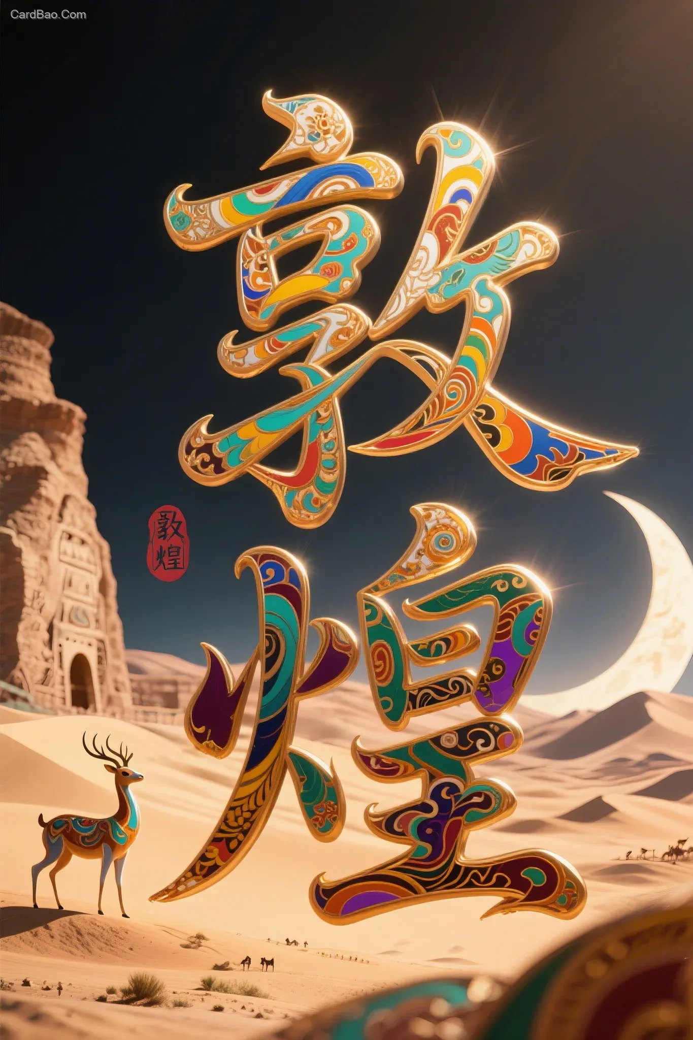 "Dunhuang", title text, vertical layout, stunning brush calligraphy font, artistic feel, three-dimensional effect, extremely gorgeous and magnificent, Dunhuang motifs, incorporating elements such as the colorful deer, Mogao Grottoes, Mingsha Mountain and Crescent Spring, and the Silk Road, light effect, exquisite, high-end sophisticated font design, impressive, unique perspective, Dunhuang color palette, high contrast
