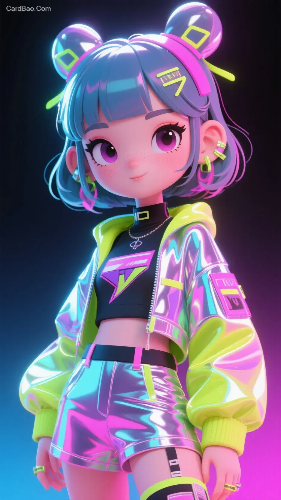A cartoon girl, fashionable and edgy, bright fluorescent color background, V-Ray tracing style, shiny/glossy, UE5, K-pop style, bold character design, realistic impression, 8K