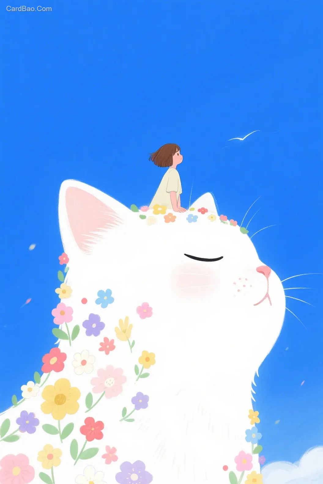 插画,画面中,一只巨大的白色猫咪,它的右眼紧闭,脸上和身上点缀着五彩斑斓的花朵 。猫咪头顶站着一个有着棕色短发、穿着浅色衣服的人,人物似乎在眺望远方 。背景是纯净的蓝天,营造出宁静、梦幻的氛围。