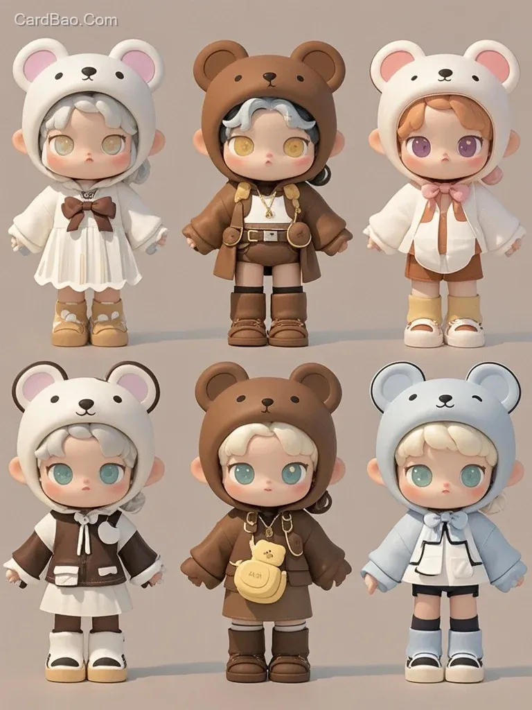 一组6张的ip形象设计,2d人物,可爱萝莉,以人物穿着小熊服饰为意向,它们之间没有联系