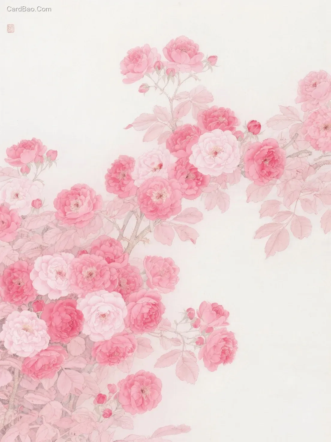 细腻的线条,墙后的满支玫红色的蔷薇花,中国工笔画,白墙,色彩鲜艳,大面积留白,完美构图,大师作品