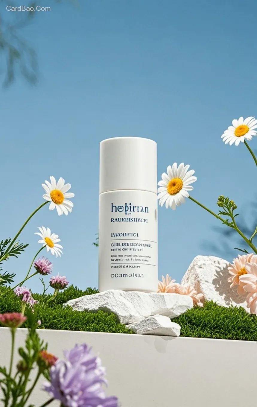 This is a product photo of Bio-Oil. Under a blue sky, the background features a grassy area with several white daisies in bloom, along with some pink-purple flowers. At the bottom is a slanted white surface, on which there are white gypsum stones. 8k.