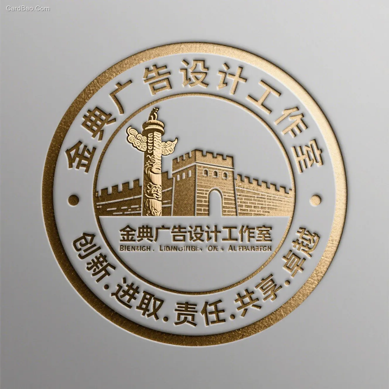 内凹陷风格,压痕效果,一个logo圆形:“金典广告设计工作室”,“创新.进取.责任.共享.卓越”,大气,时尚,新潮,圆圈内是长城与华表图案,图圆形外圈,灰色与金色随机组合,8k,