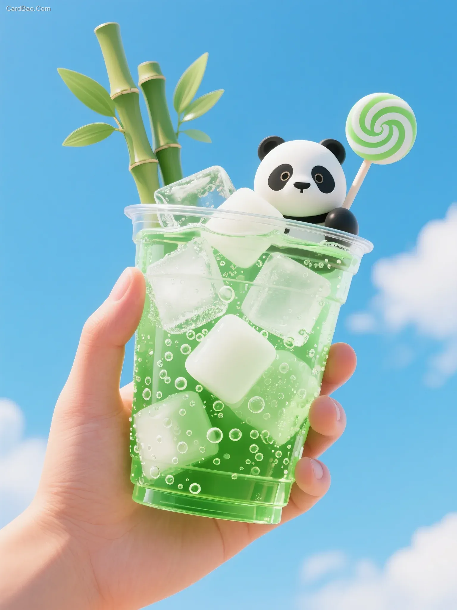 写实风格摄影,手拿着1杯敞口气泡水冷饮饮料展示,冰块的质感纹路和气泡清晰可见,C4D渲染,背景蓝天白云,商业摄影,冷饮杯:绿色气泡水+白色果冻+熊猫糖+竹子装饰,